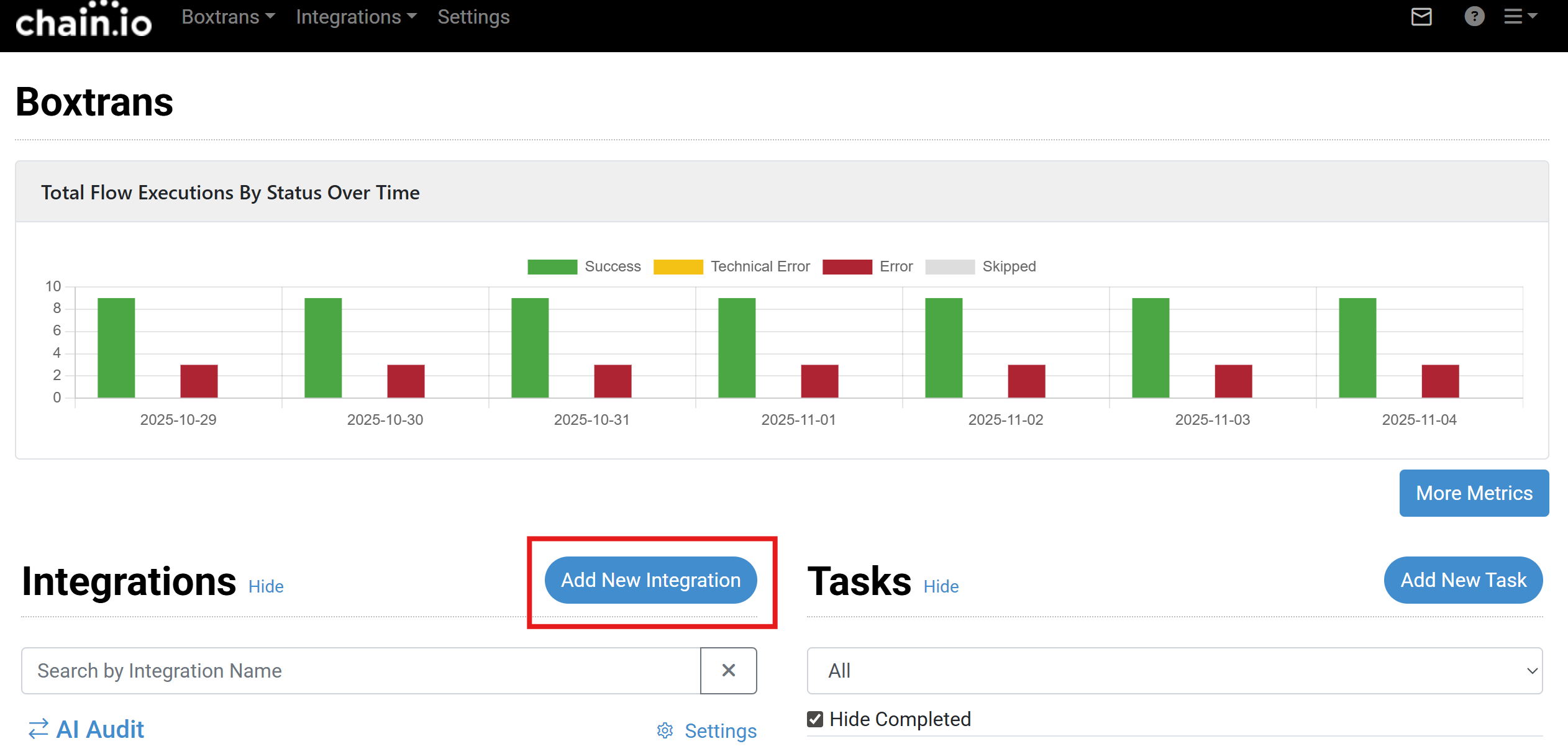 To add a new integration, click the Add New Integration button on the main workspace screen.