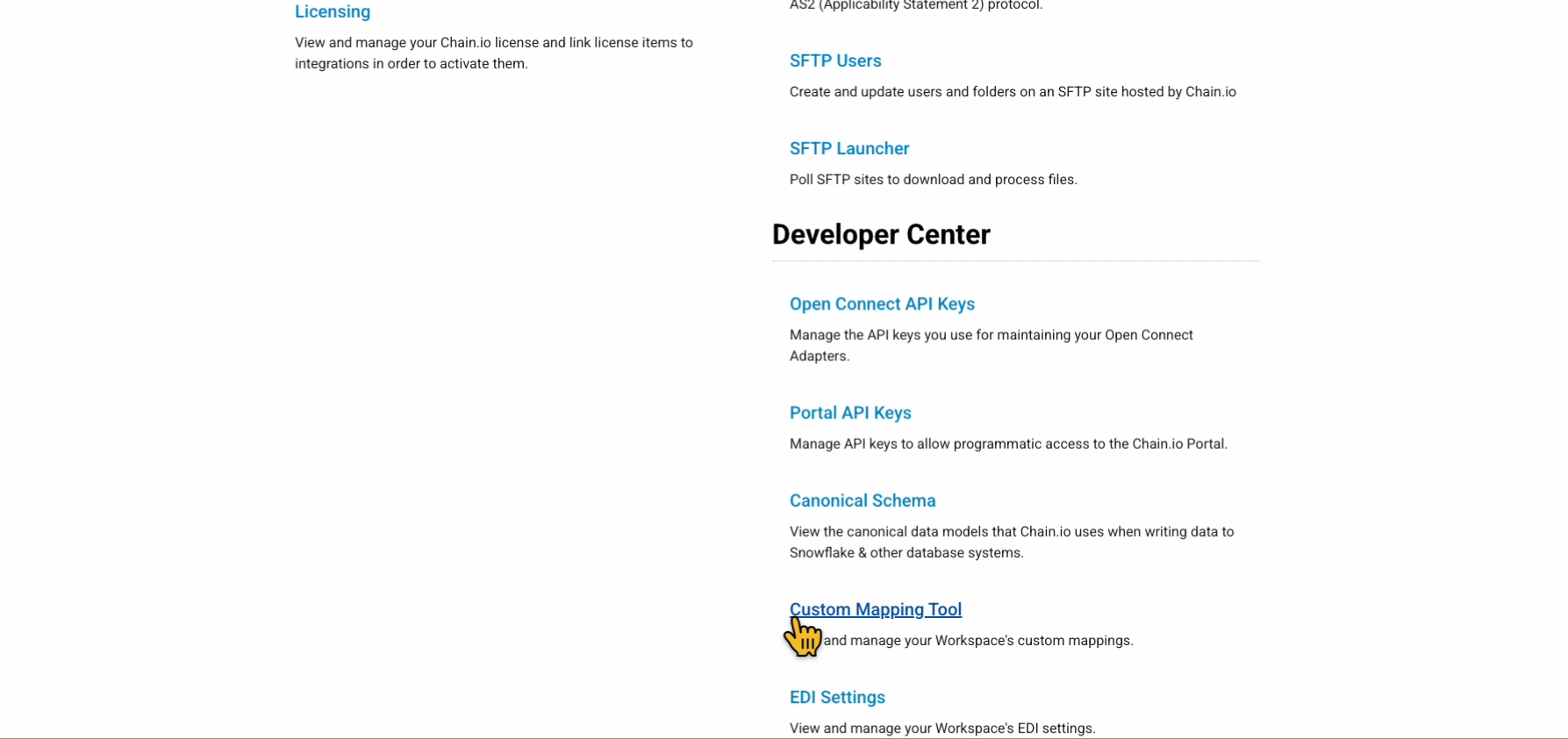 This guide relies heavily on the use of the Chain.io Custom Mapping feature and it is helpful to have a familiarity with how it works, specifically how it uses JSONata to map data. Please review our product documentation on the feature as well as the documentation for JSONata functionality.