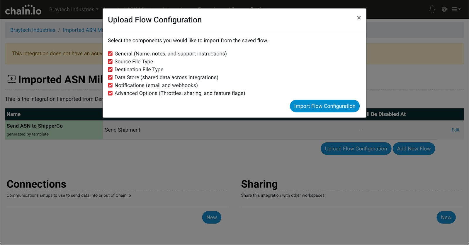 You can now upload this file to another Integration within Chain.io that supports the downloaded Flow type. Continue reading for instructions on how to upload this Flow configuration file to an Integration