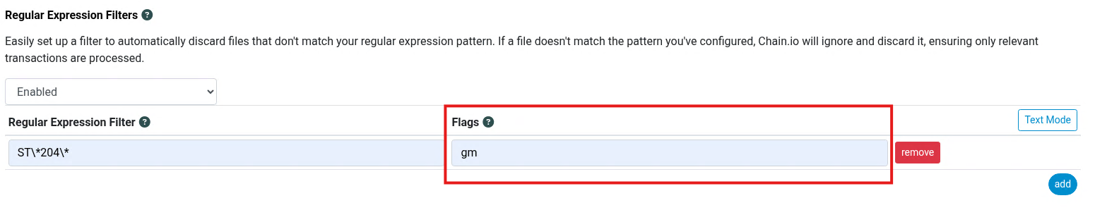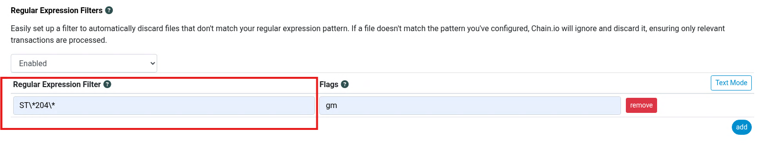 Select Enabled from the dropdown then click the Add button to add a new Regular Expression Filter: