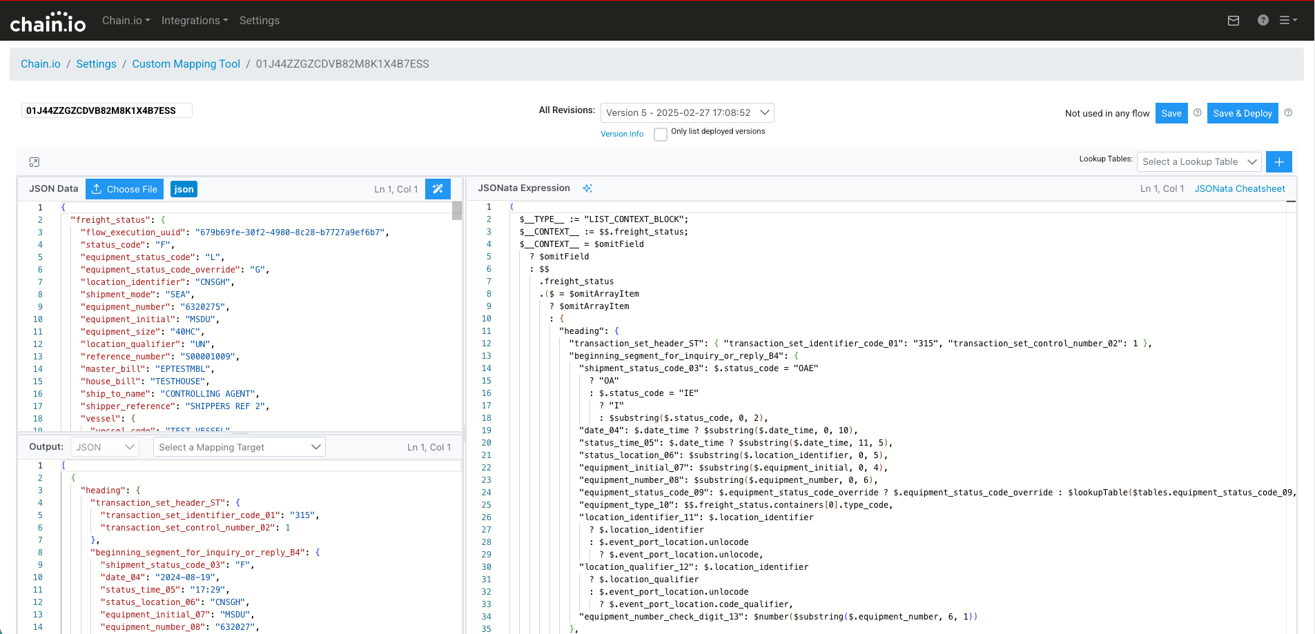 Chain.io's Custom Mapping Tool turns complex data transformation into a fast, flexible task. Use the Custom Mapping Tool to have more integration flexibility and customization of your data mappings within your Flows. The JSONata Expression panel provides greater control over how data points are handled between uploading an input file and producing a customizable output file. Finally, the vast selection of file output formats offers you the opportunity to instantaneously tailor data transformations and guarantee data compatibility when exchanging information between suppliers, freight forwarders, customers, customs authorities, and financial institutions.