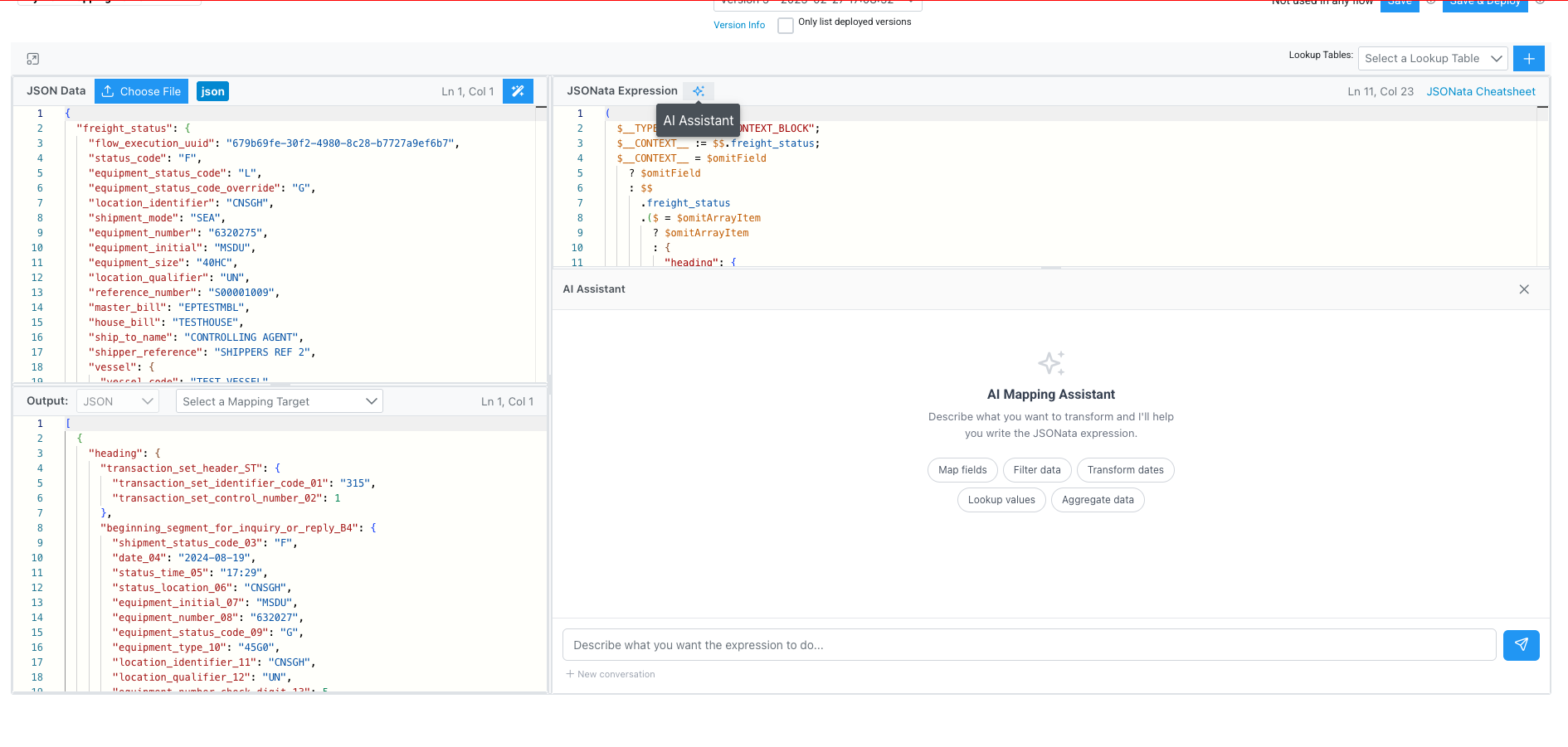 - Edit the JSONata expression to customize your solution. You can write expressions by hand, or use the AI Mapping Assistant to generate them from a plain-English description. The Output panel on the lower left updates in real-time, so you will know instantly if your mapping is working and what data is flowing through.