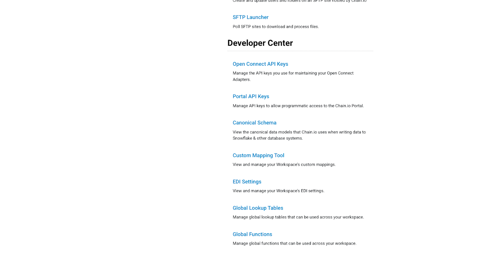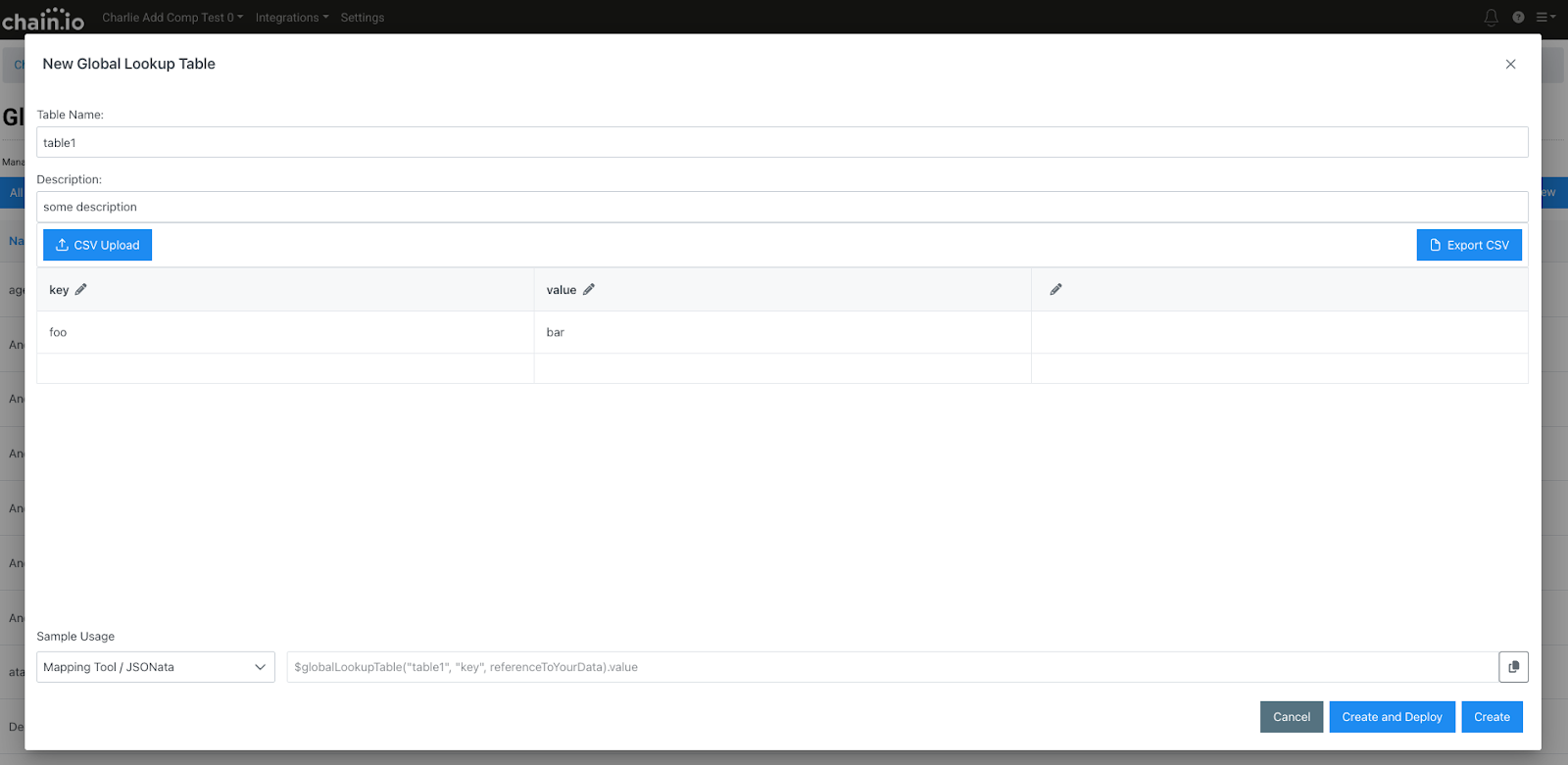 Lookup tables are only available in the mapping in which they were created. By comparison, the global component of Global Lookup tables expands the Lookup table functionality by making the tables available for use in multiple areas of the Chain.io platform. Global Lookup tables are accessible in all of your custom mappings, custom processors, and XSL transformations.