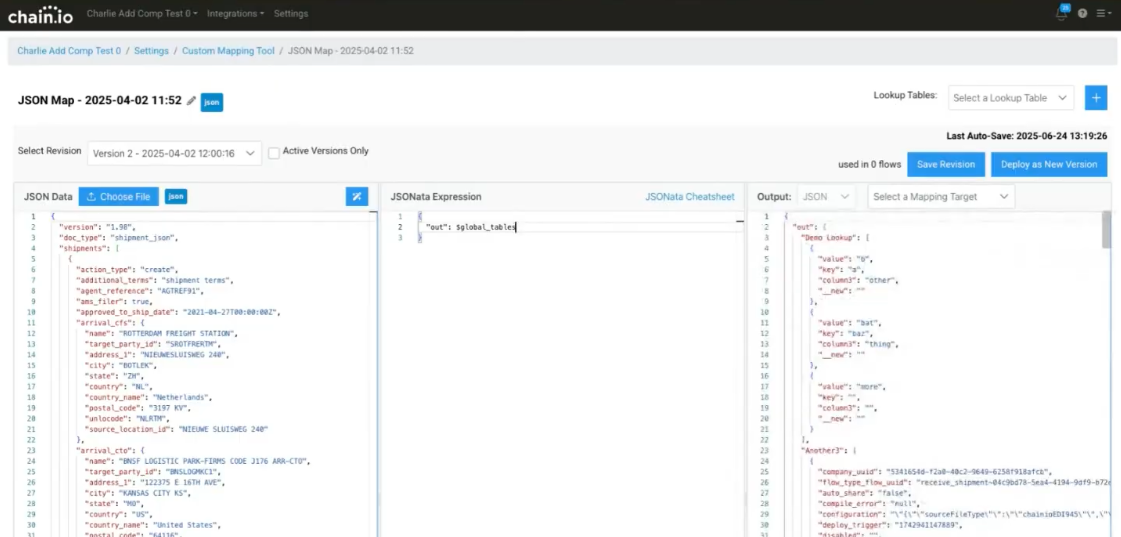 2. Edit the JSONata expression in the JSONata Expression panel to configure your custom mapping and reference your Global Lookup table in the expression as needed.