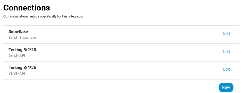 - Integration settings now display the connection type (e.g., S3, API) alongside the connection name and edit button. This addition provides users with more information at a glance when managing integrations.