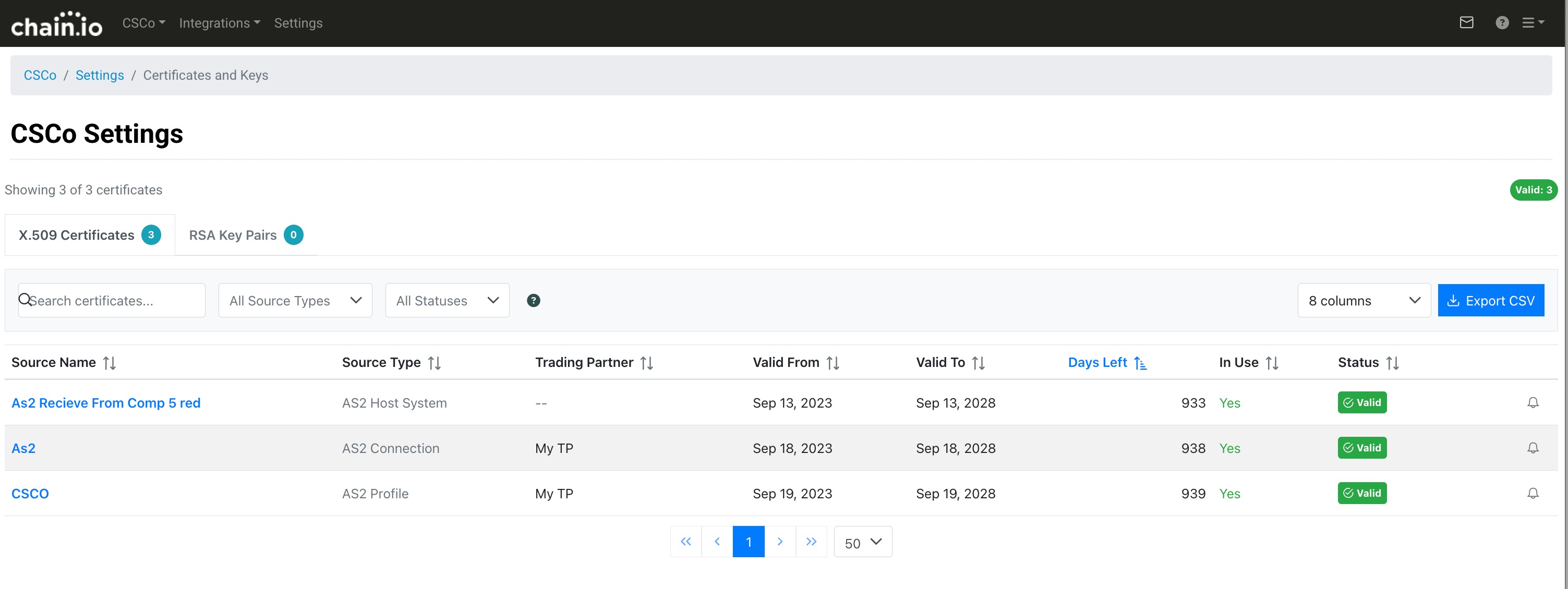 | In Use | Whether this certificate is actively in use by an integration, including acknowledgment channels (997/CONTRL). Shows "Yes" or "No". | Yes |